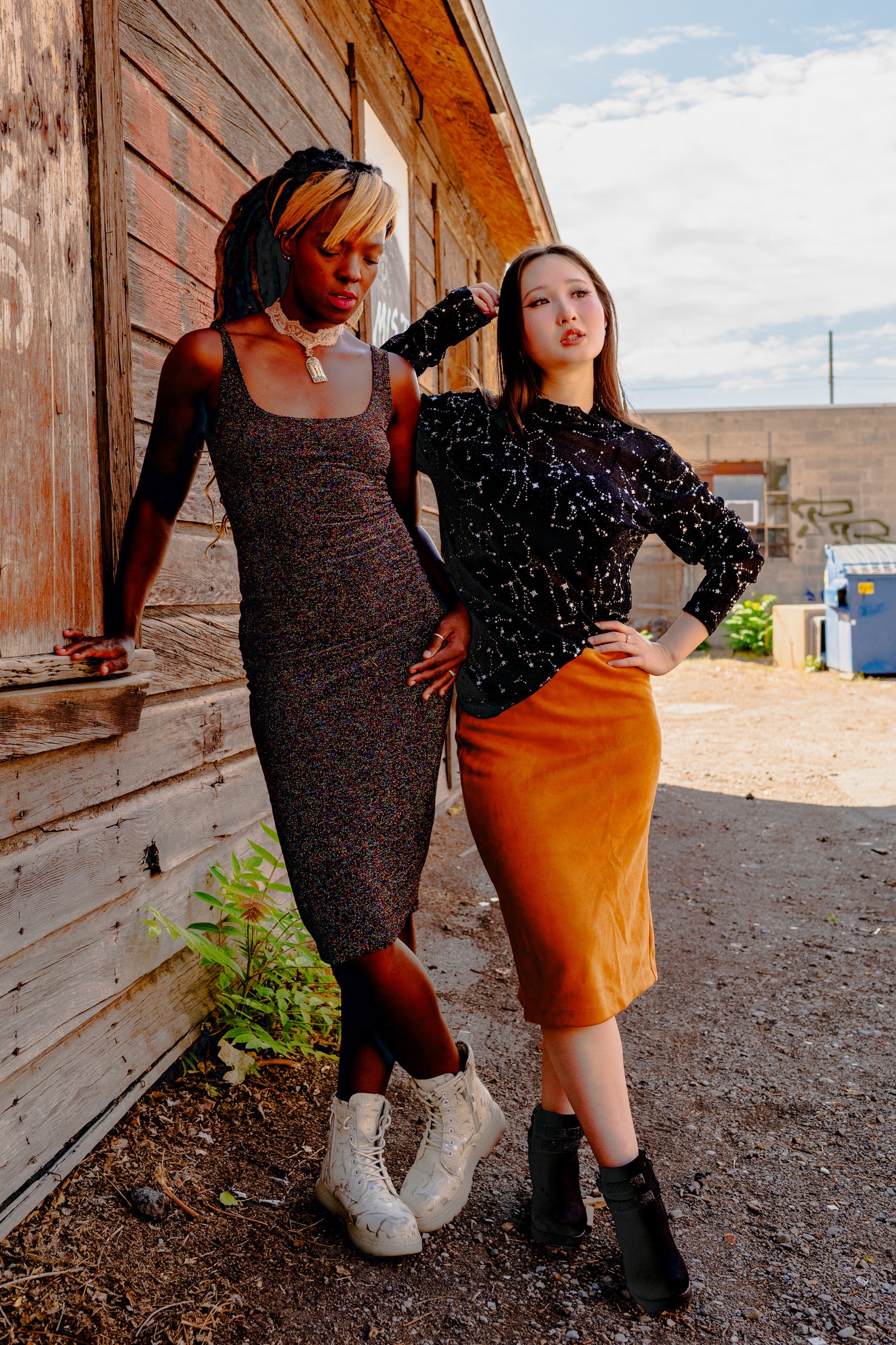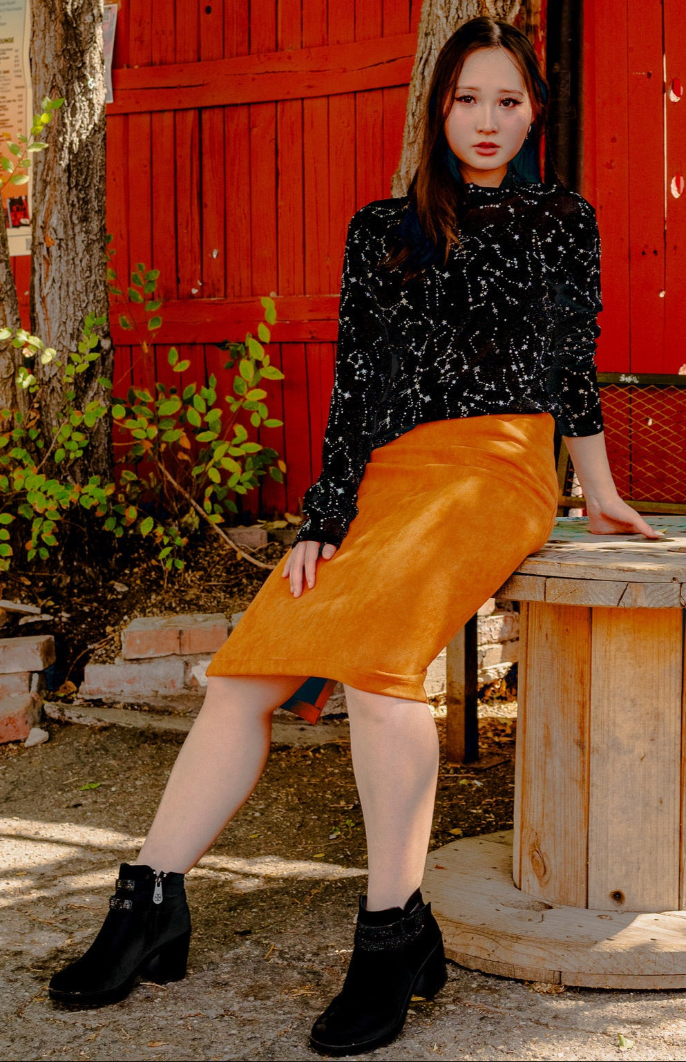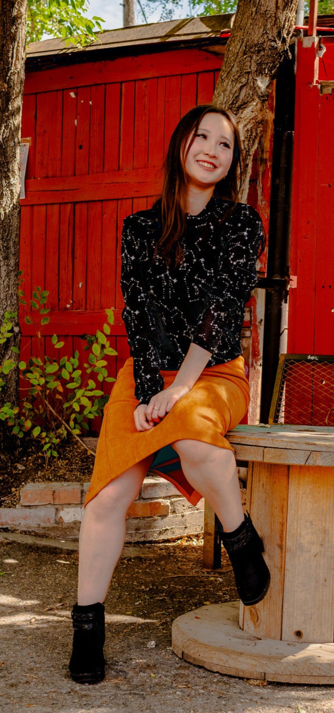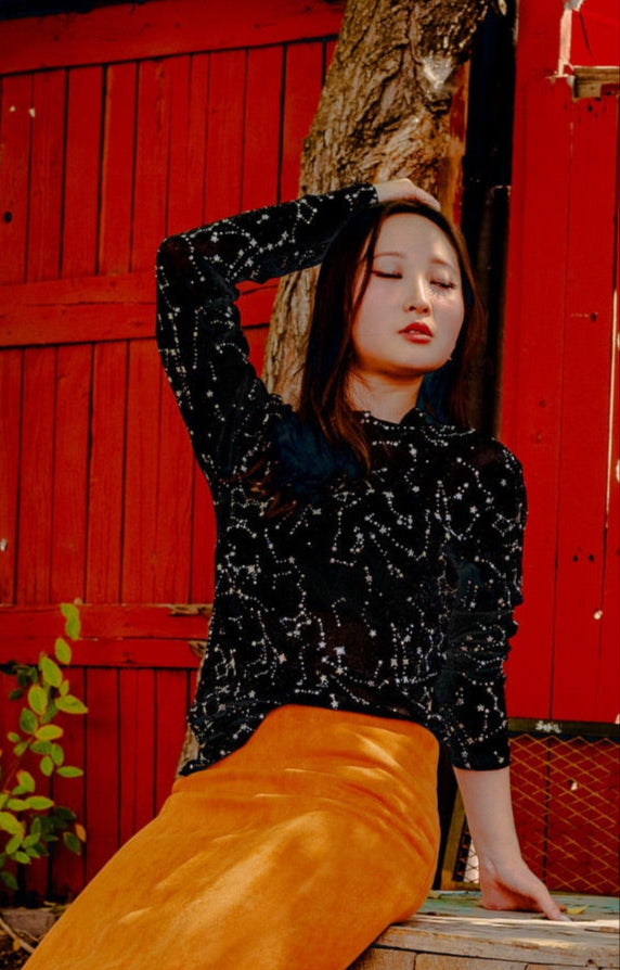 Sheer black long-sleeve made from a stretchable fabric with constellation and star detailing for a look that is out of this world.