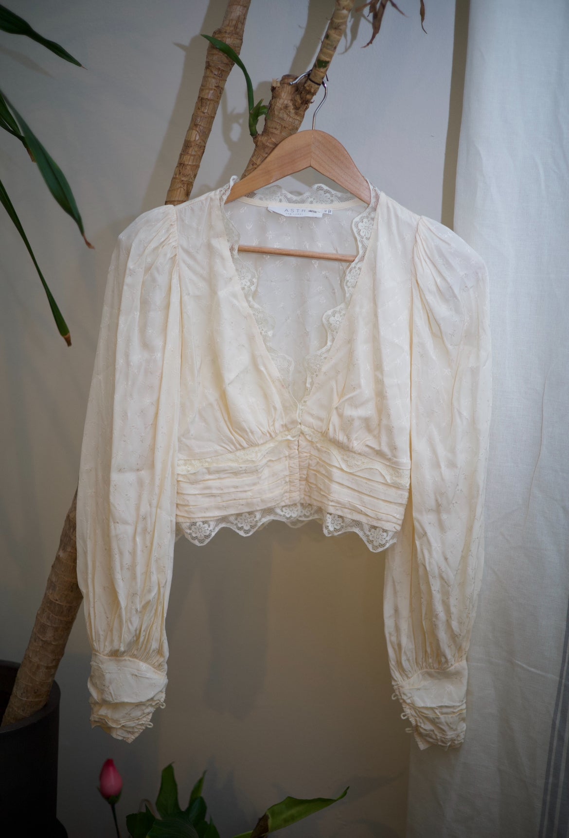 Cream long-sleeved blouse with pretty pattern on fabric & lace.