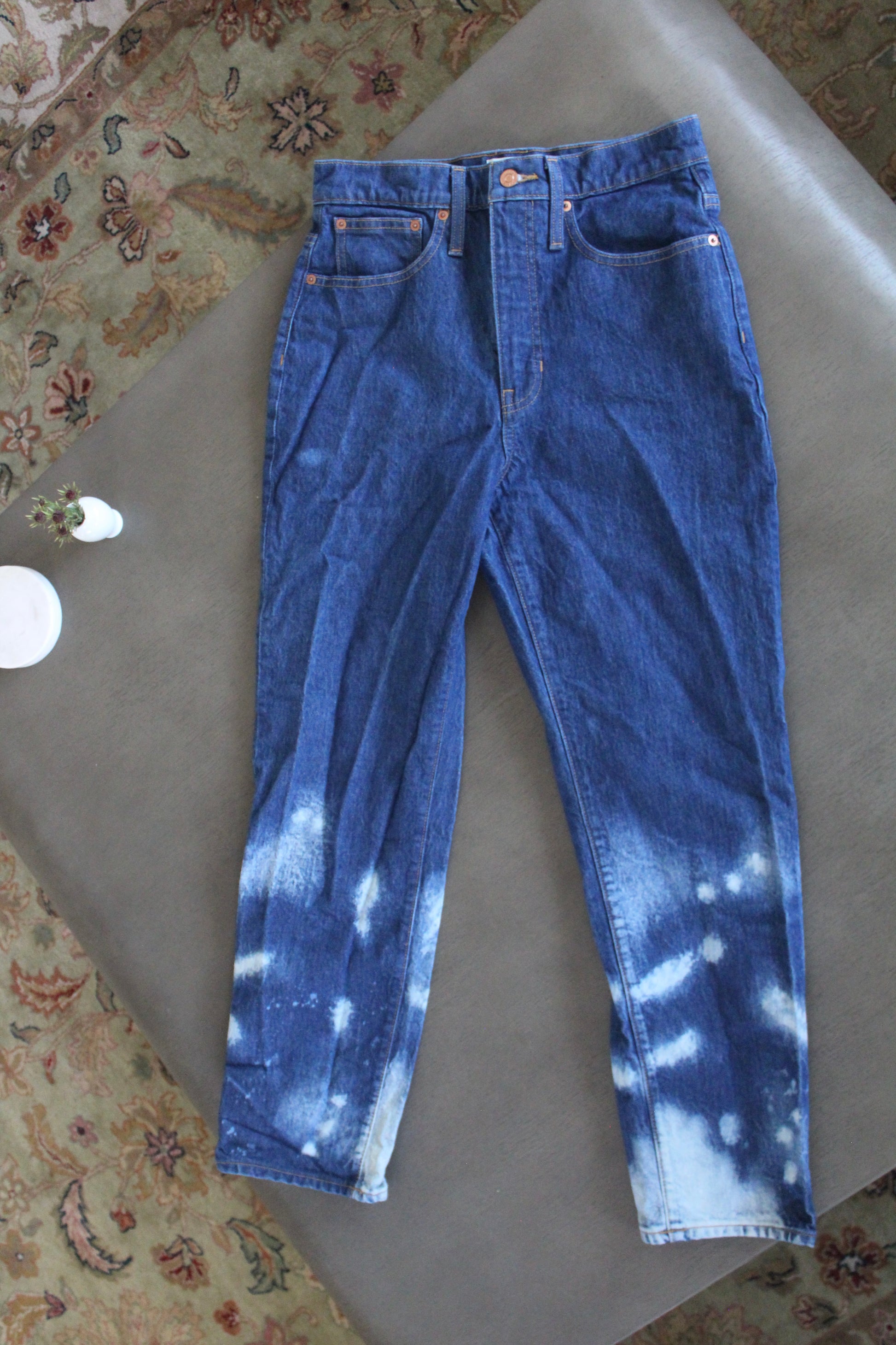 J.Crew slouchy boyfriend jean with bleached splotches on the lower legs.