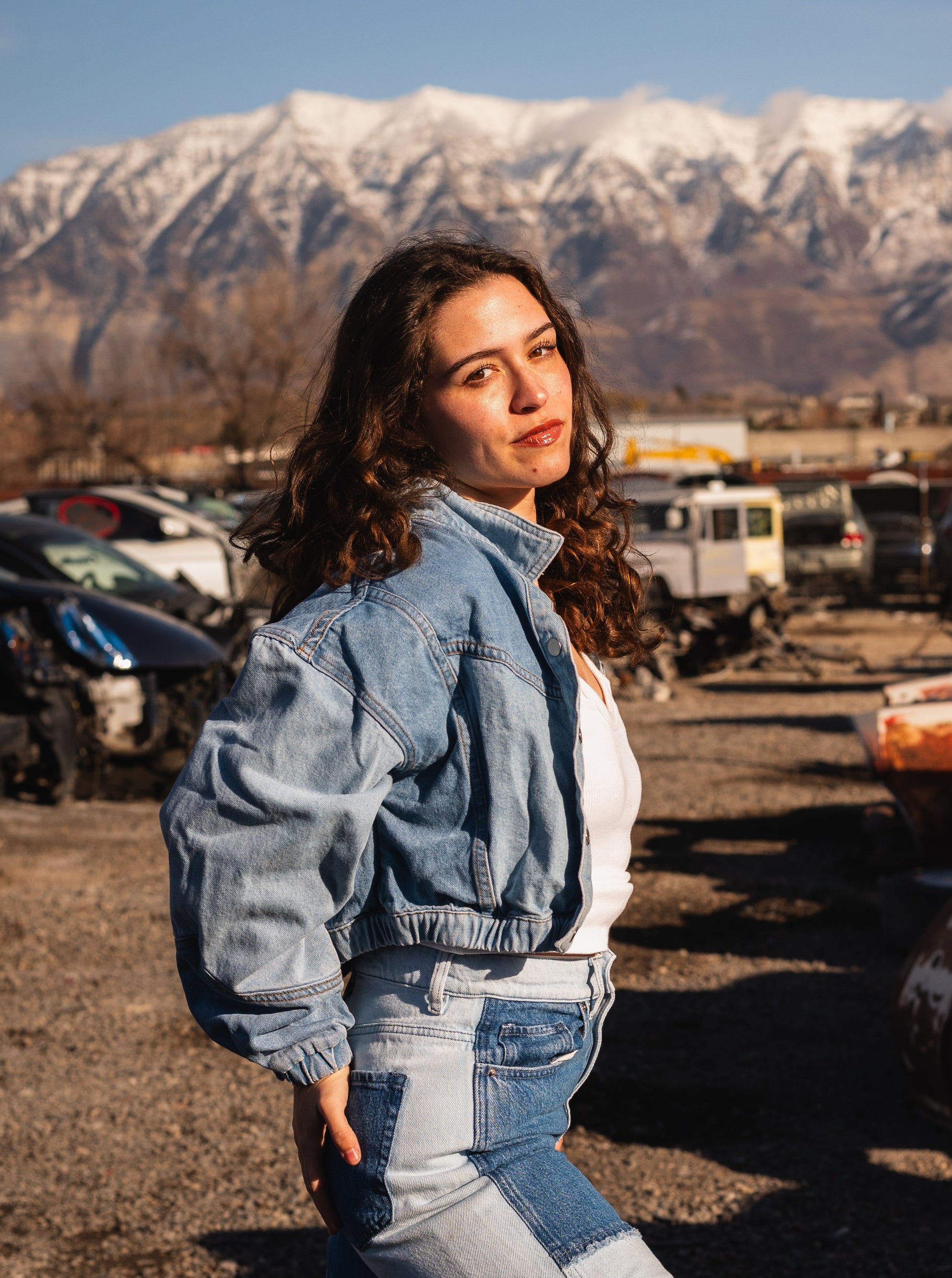 Multi-toned jean jacket with buttons and scrunched waist. Slightly cropped fit.