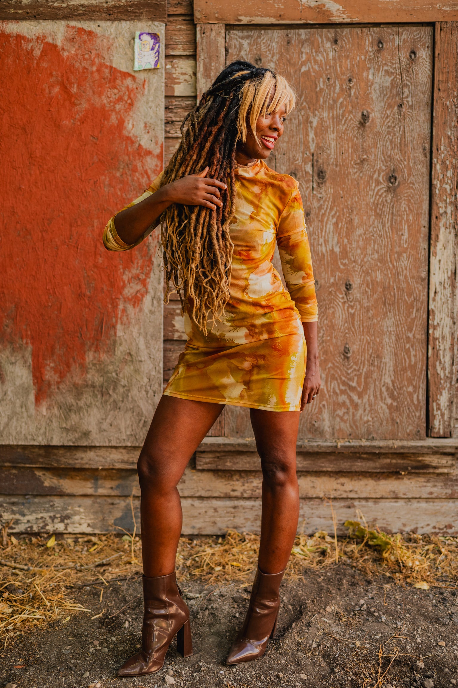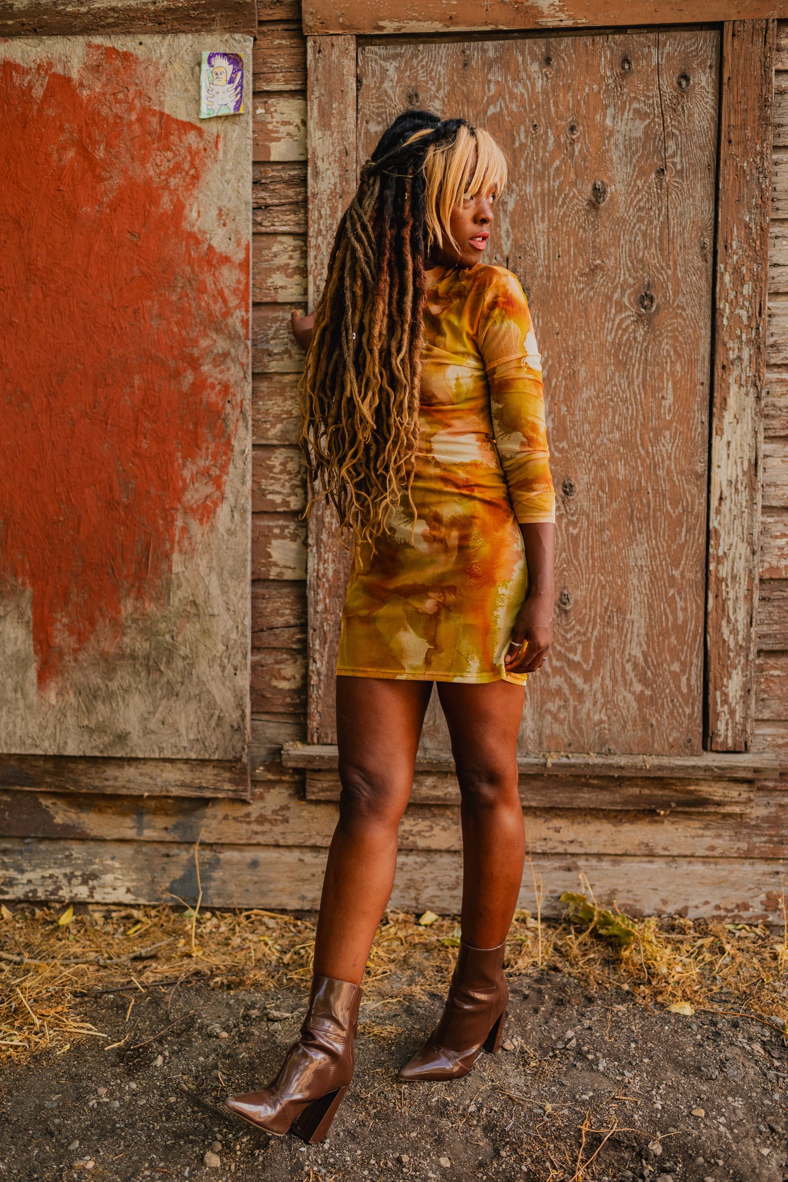 Brown and green watercolor long-sleeve dress. The dress includes a connected slip underneath as the dress itself is made from a slightly see-through material.